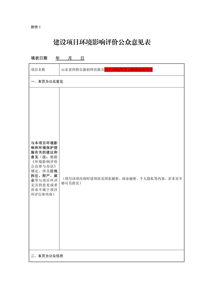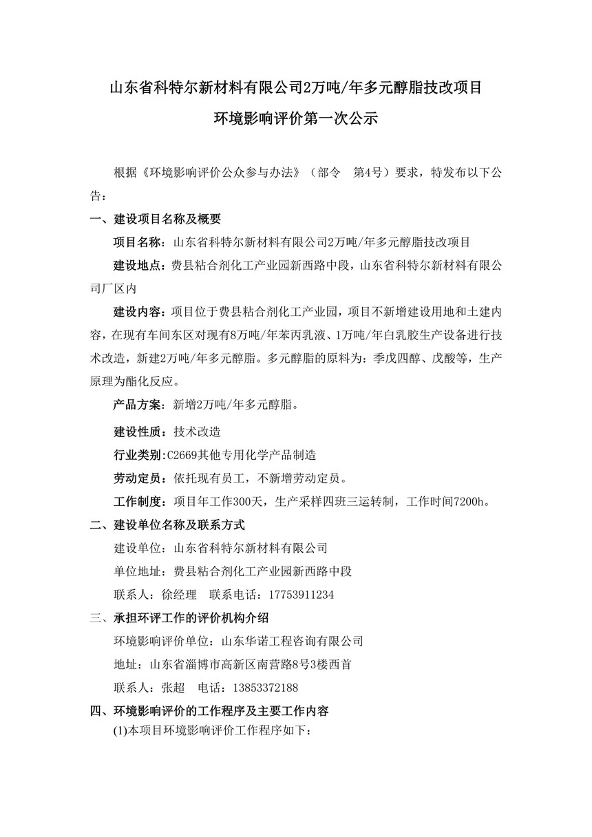 山東省科特爾新材料有限公司每年2萬噸多元醇脂技改項(xiàng)目